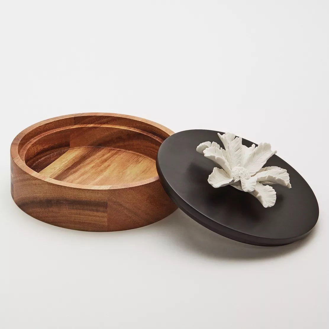 Son couvercle en bois laqué noir est surmonté d'une fleur de palmier en porcelaine. Y déposer 2 à 3 gouttes d'huile essentielle ou de parfum transformera cette jolie boîte en un diffuseur de parfum.