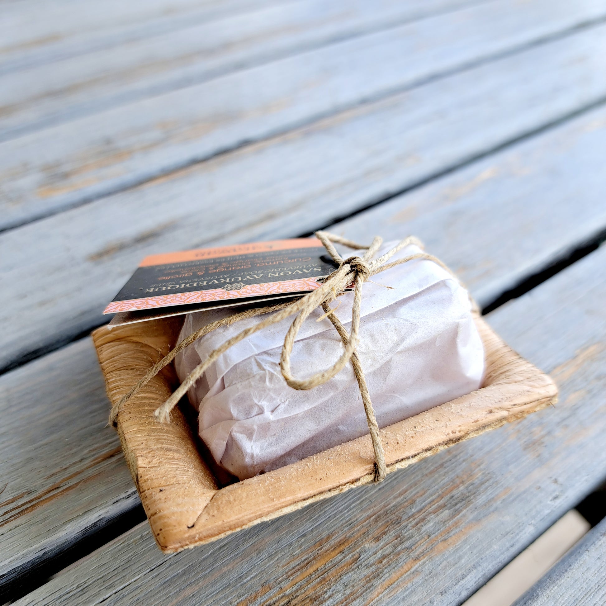 Respectueux de l'environnement, le savon solide ayurvédique se présente dans un mini Eco pack en feuille de palmier au format nomade 20g, ce qu’il y a de plus minimaliste tout en restant bien protégé.